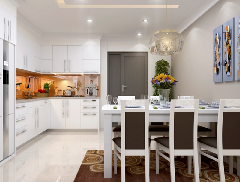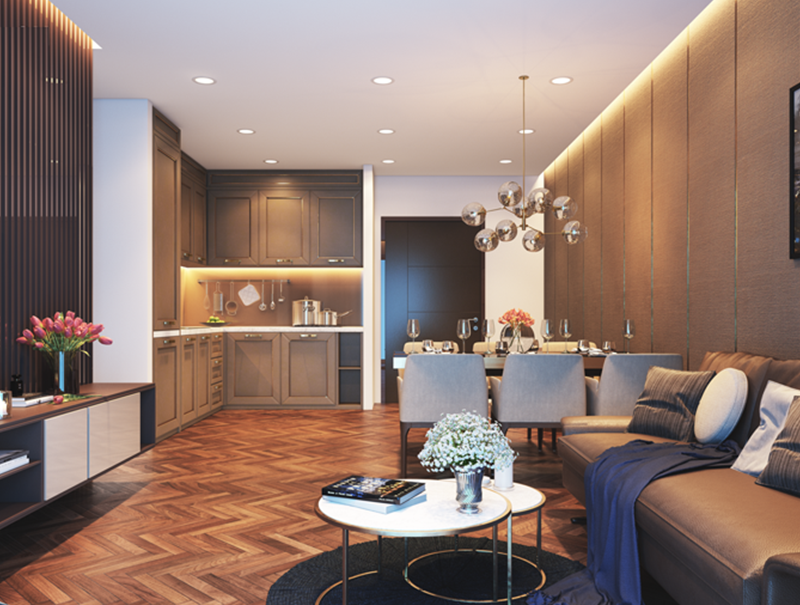 Khu phòng khách được thiết kế nối với khu bàn ăn, có ban công riêng, giúp tối ưu diện tích và thuận tiện trong sinh hoạt..